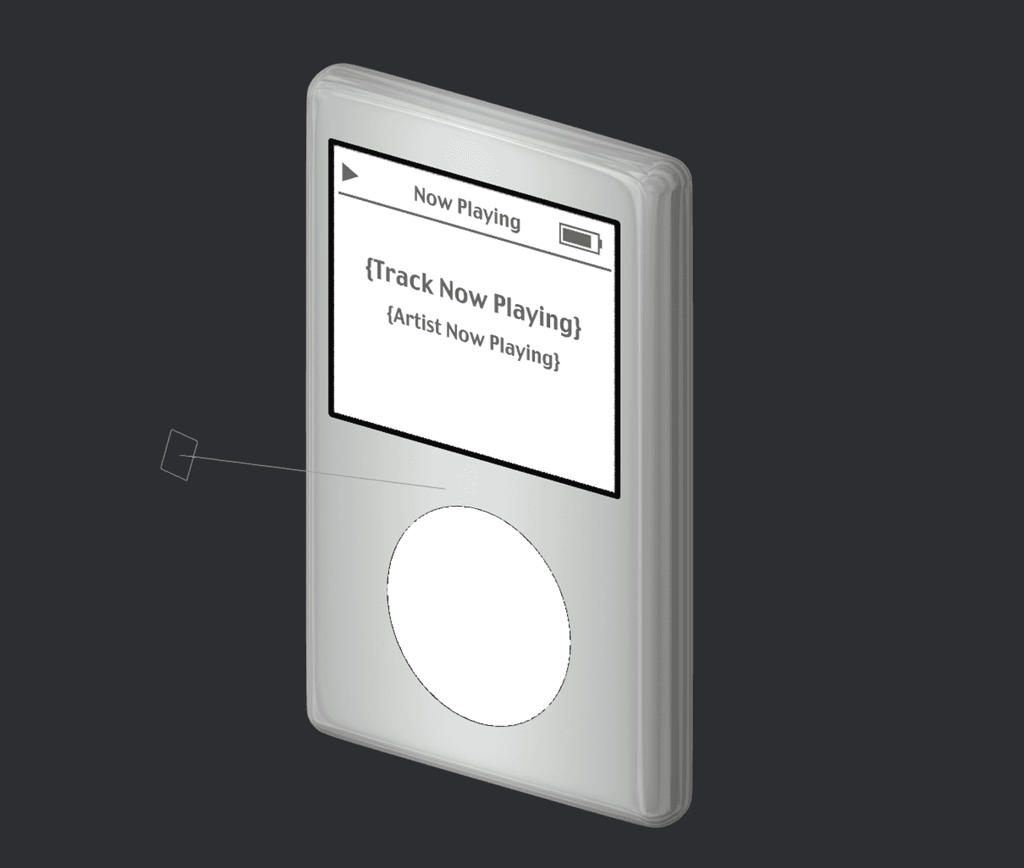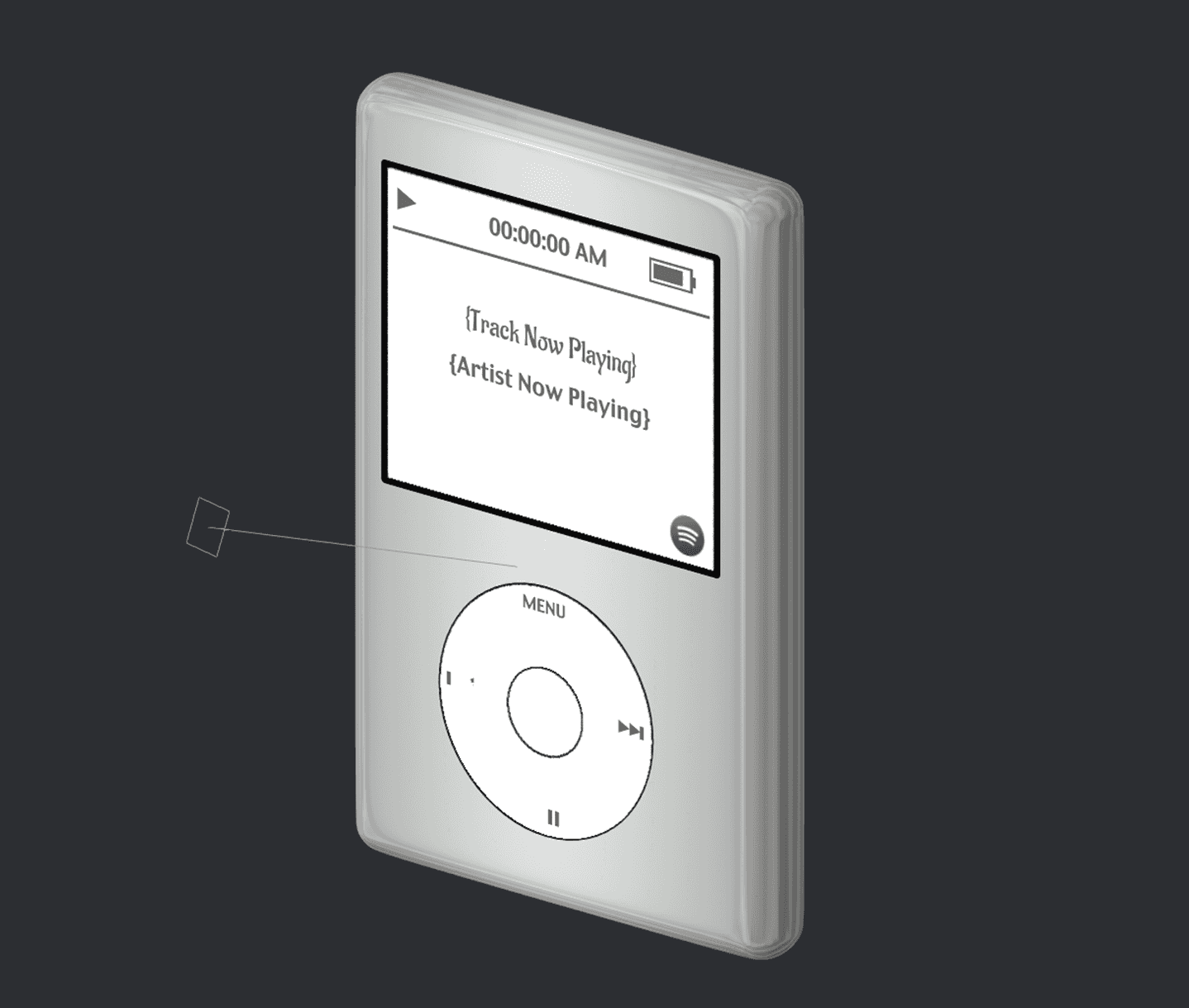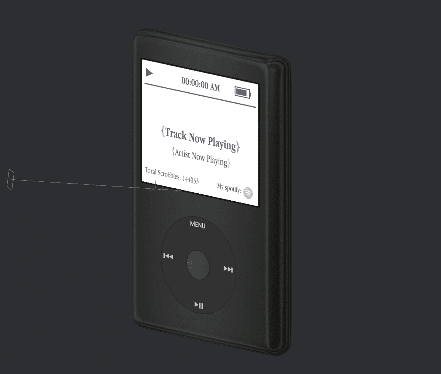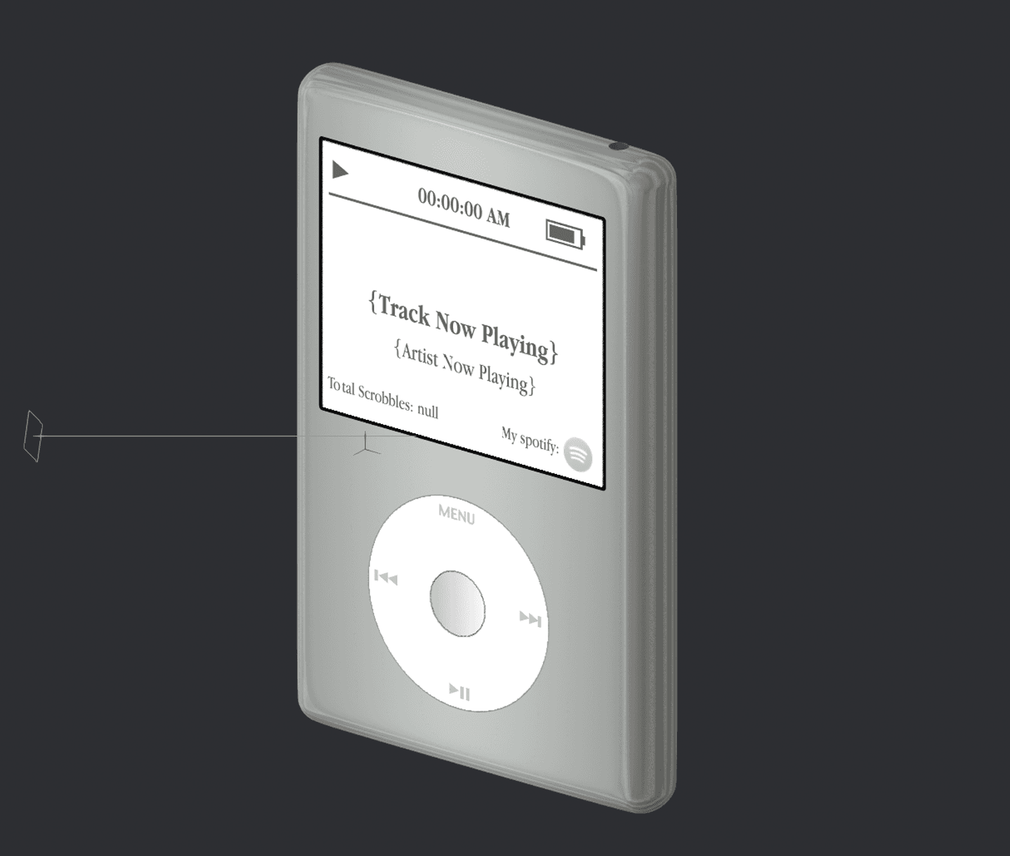 For the text overflow, I considered nearly every solution. There is no support for text truncation in Spline's native software. I thought about making a variable that changes based on the length of the track and creating logic that adjusts the size of NowPlayingTrack font but Spline also doesn't support this. I also considered mimicking the iPod wherein text bleed loops around (marquee effect) but again this is unsupported. Long story short, there seems to be no solution in Spline at the moment.
