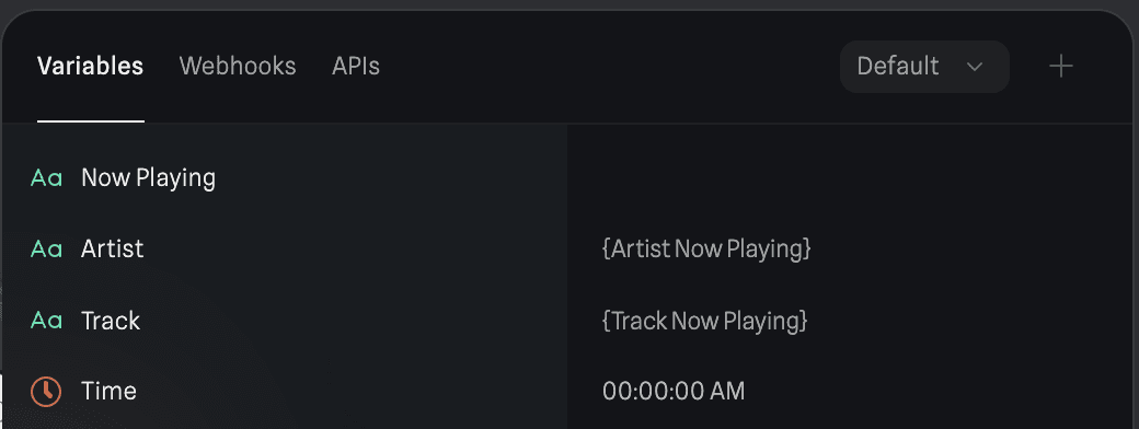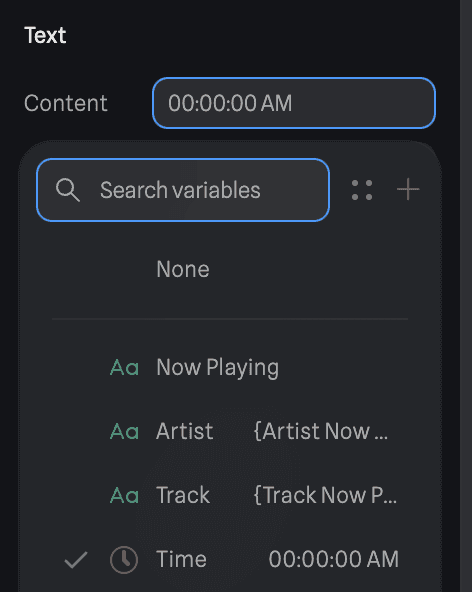 The logic for setting up 1, 2, 3 and 6 were fairly simple. Create variables named Artist, Track, NowPlaying, and Time. Time is just the current time and updates automatically from Spline.
