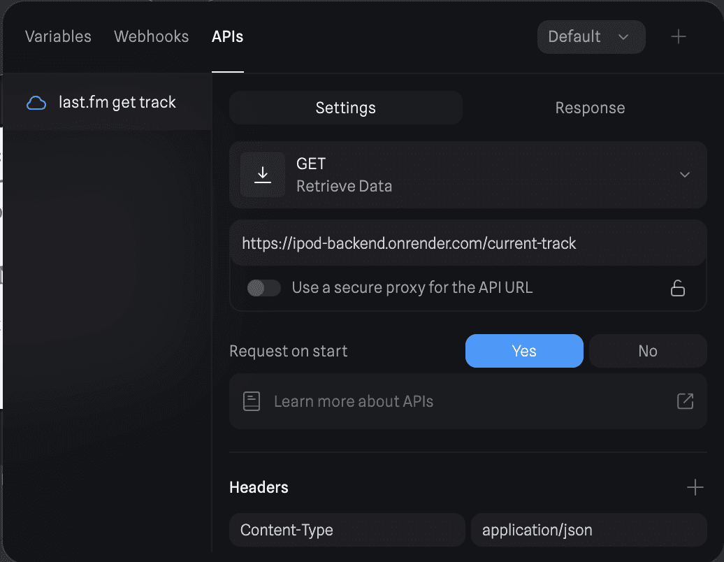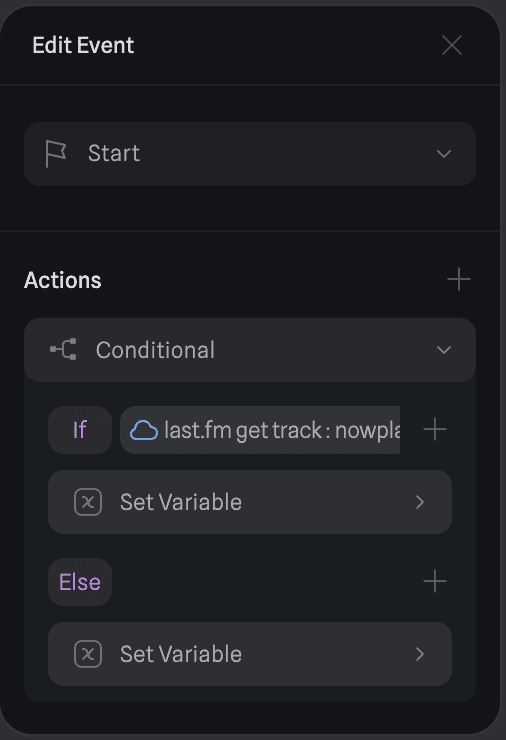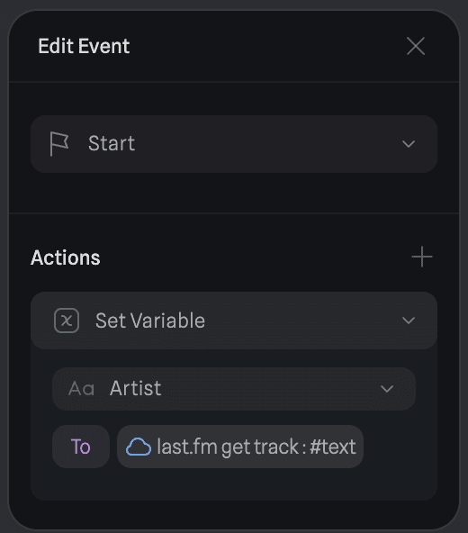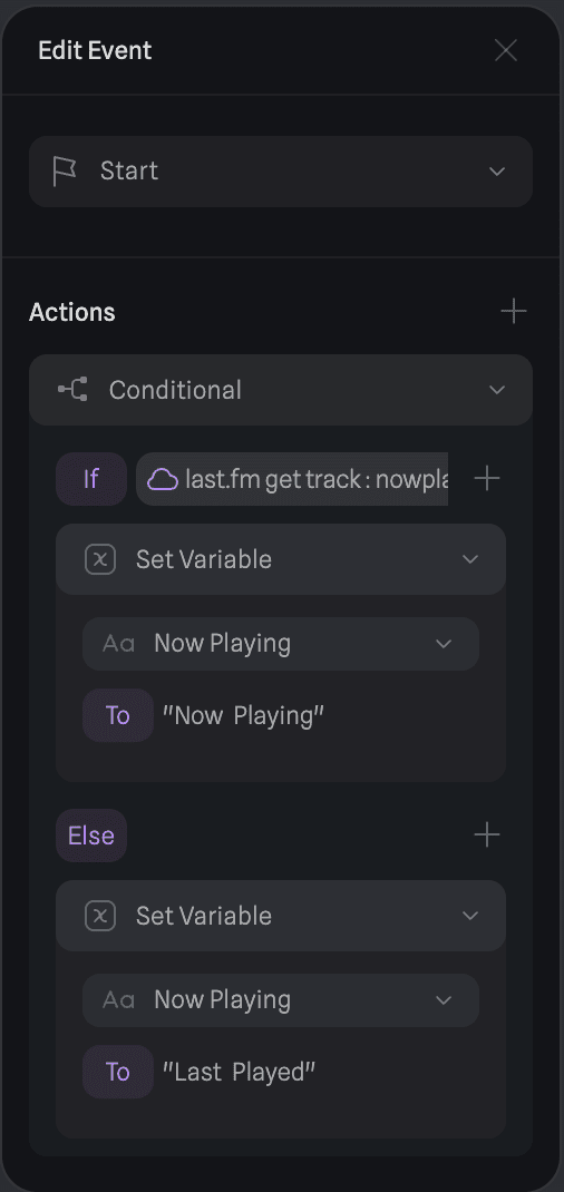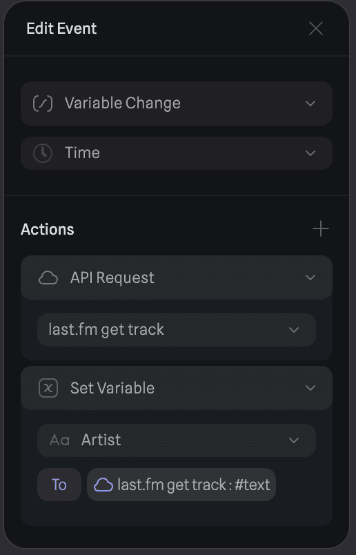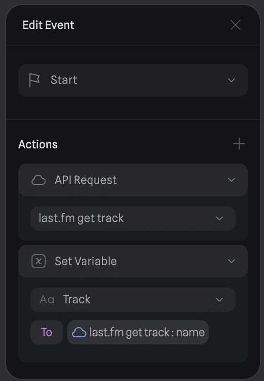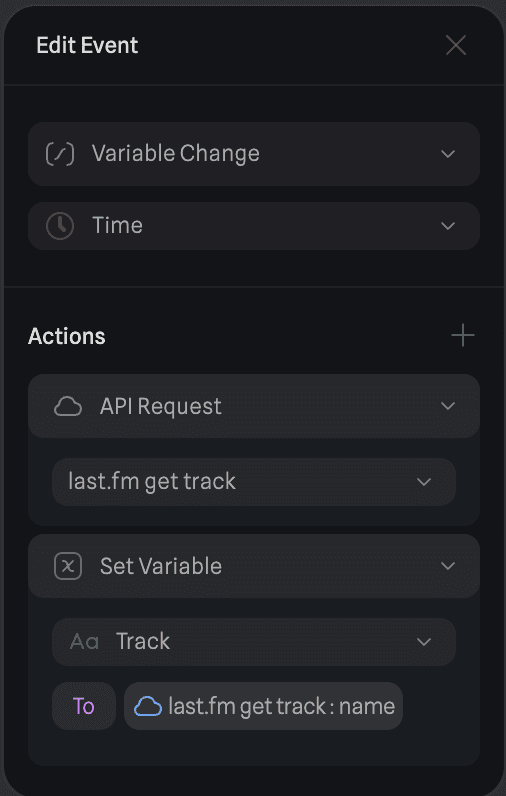 The logic was quite simple: on start, make an API request to getRecentTracks and then set Track to the track name from getRecentTracks. Similar logic follows for the artist. I also just needed to create a text variable and bind it to Time to display the time. The API response also contained a boolean nowplaying which meant I just needed to check if it was true or false and set the text accordingly.