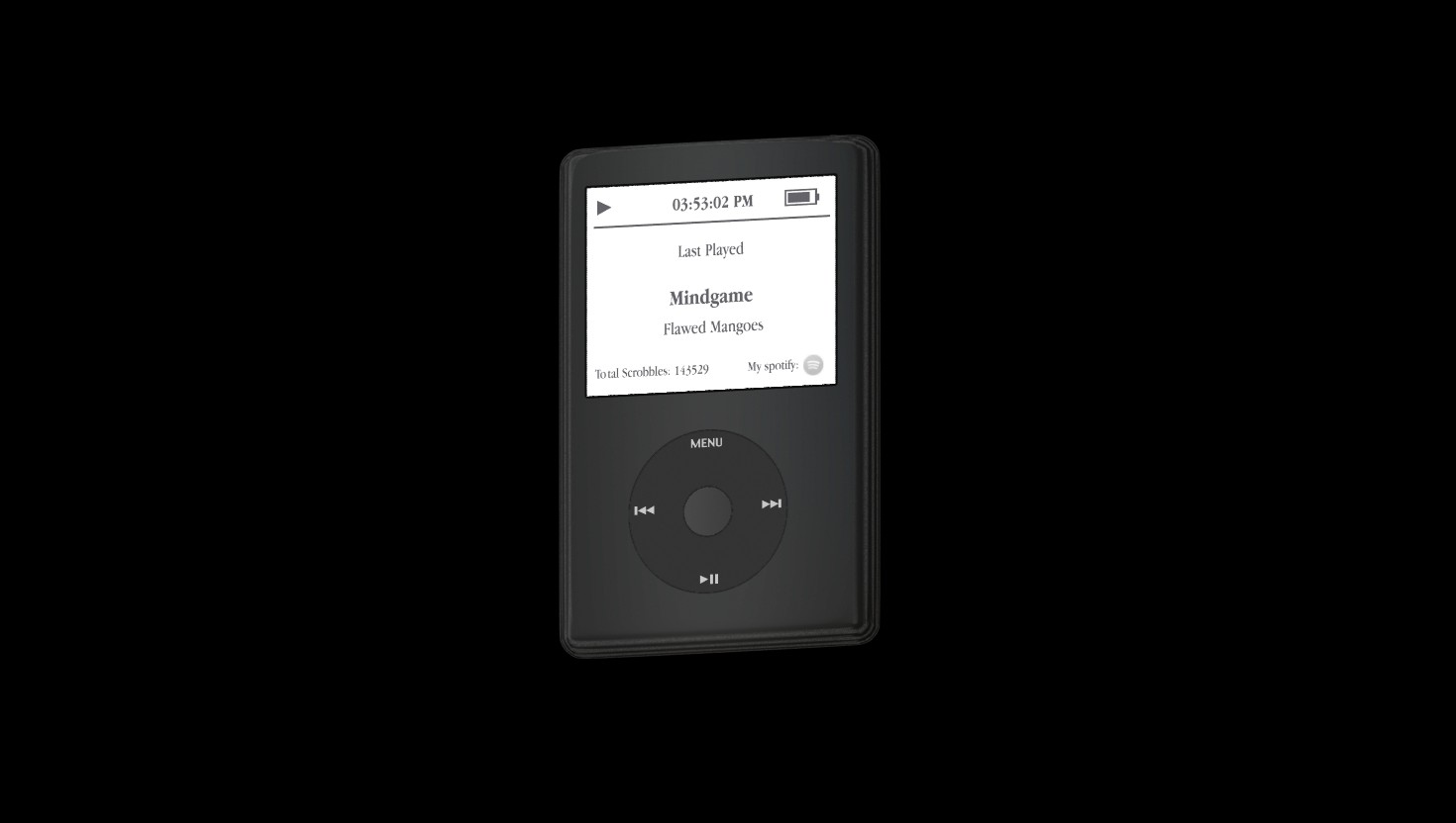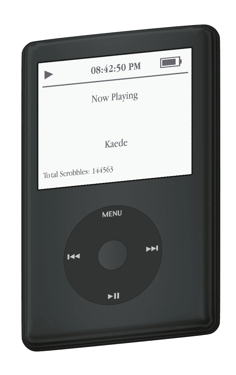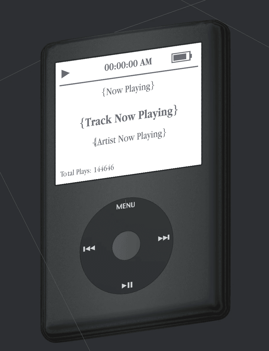 Listening to music has been a constant influence in my life as long as I can remember across 8 countries, 20 years (and counting). According to Spotify, I listened to 2126 hours in 2021, 2198 hours in 2022, 1500 hours in 2023, and 1170 hours in 2024. While designing my website, I wanted something to authentically reflect this long-standing enthusiasm for music. I've also always had an inexplicable nostalgia for old technologies like the iPhone 3GS, Nintendo DS, and the iPod. And with that in mind, I set out to create an interactive iPod model for my website that displays what I am listening to in real-time.