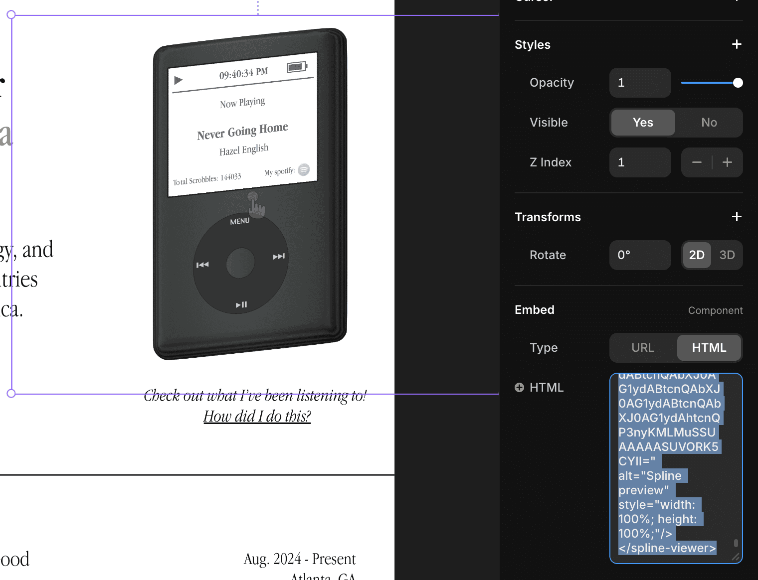 I reduced subdivisions on the iPod and removed the headphone jack. Though it compromised aesthetics slightly, load times were perceptibly faster and it was web-ready. Spline's export features made it simple to embed on a website in its native viewer; I had to create an embed in Framer and paste in the HTML code.