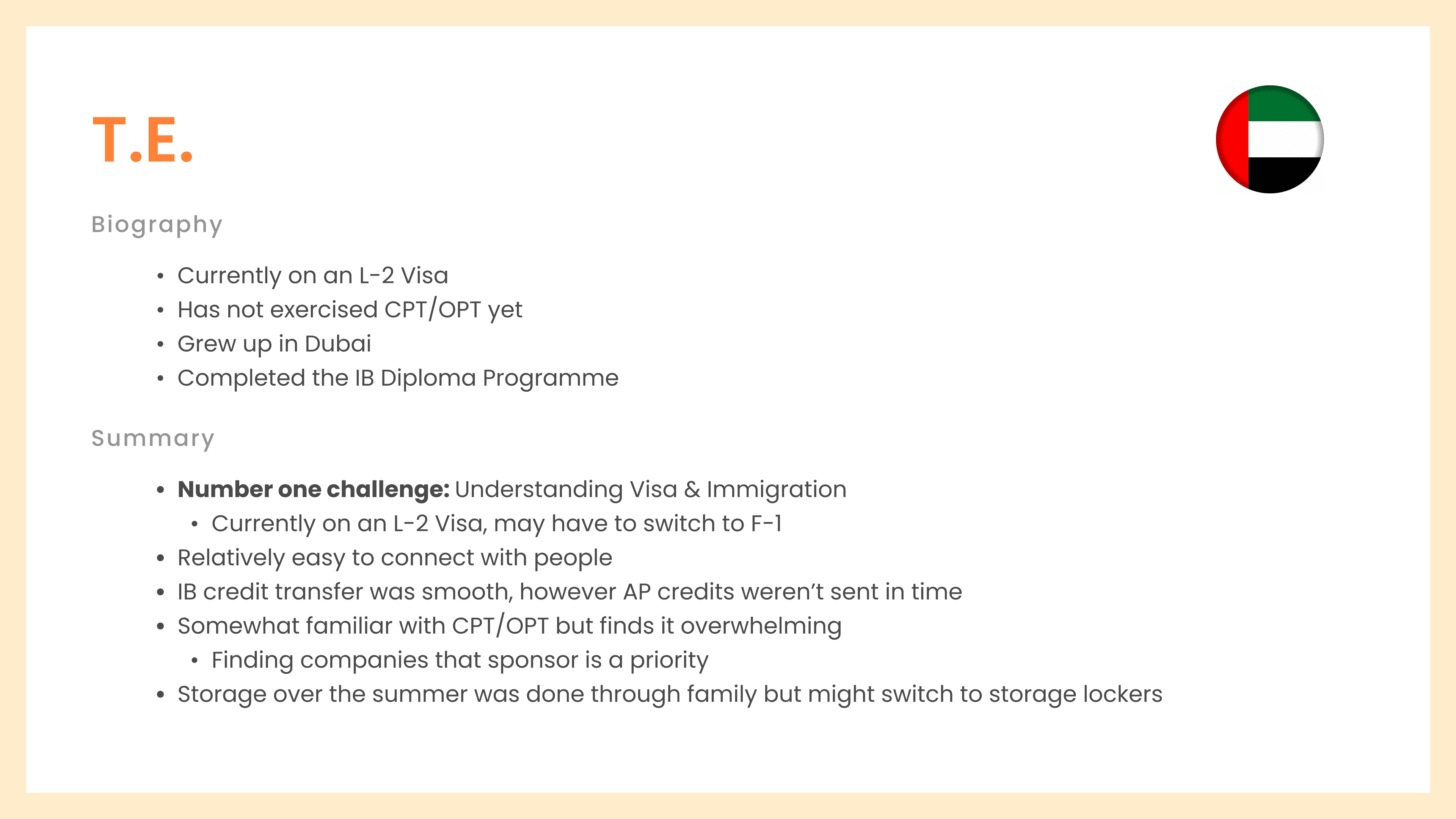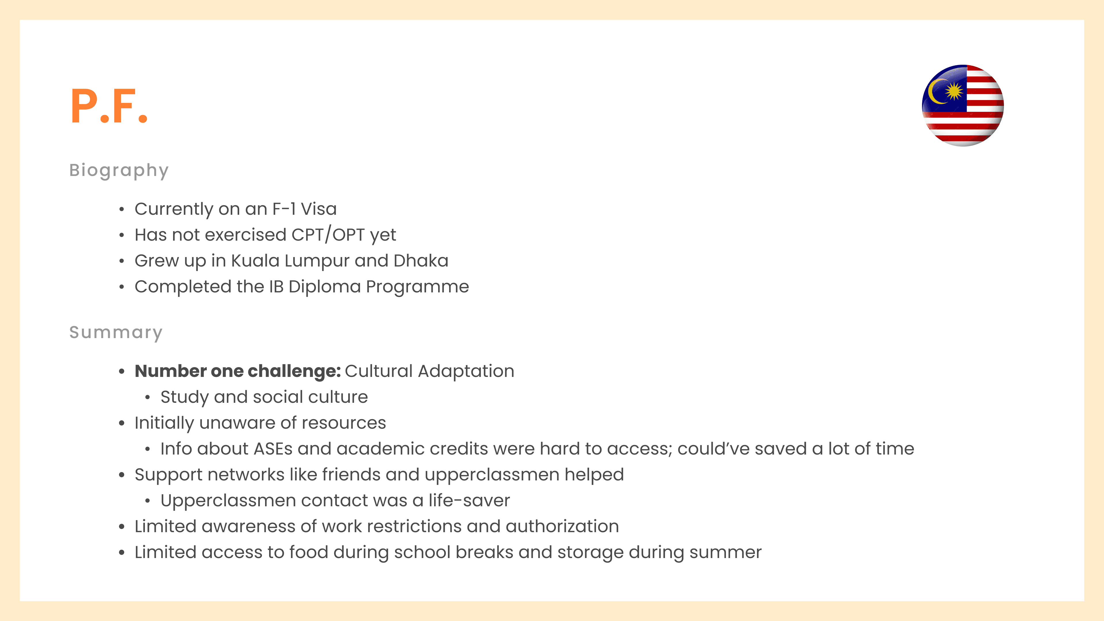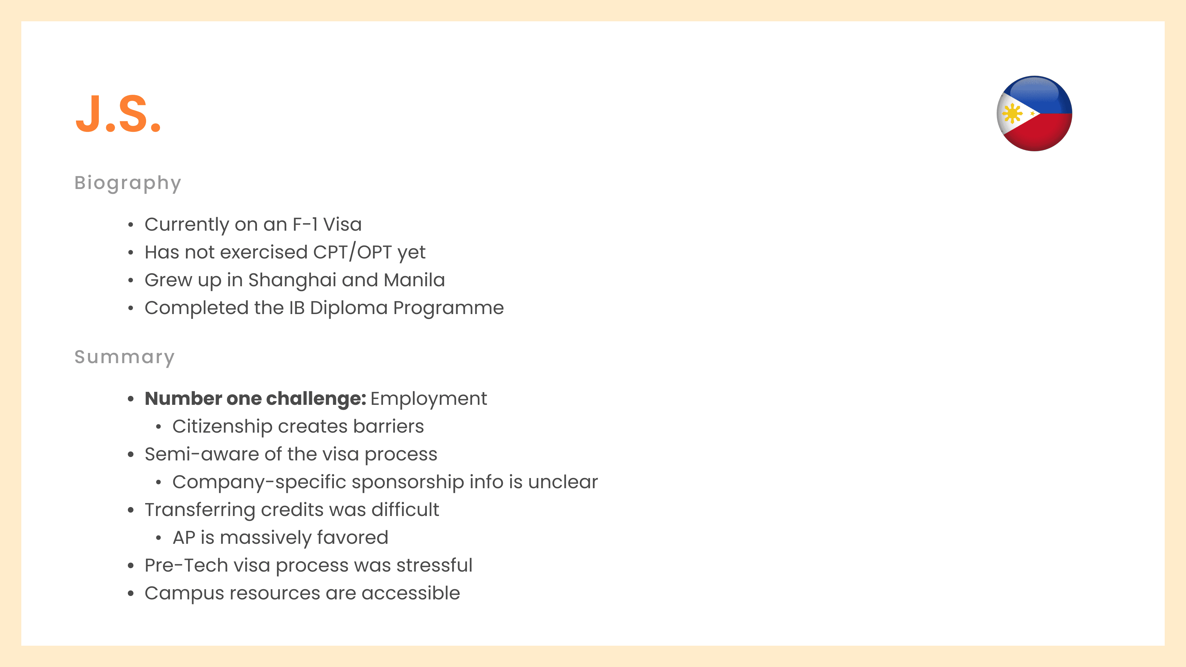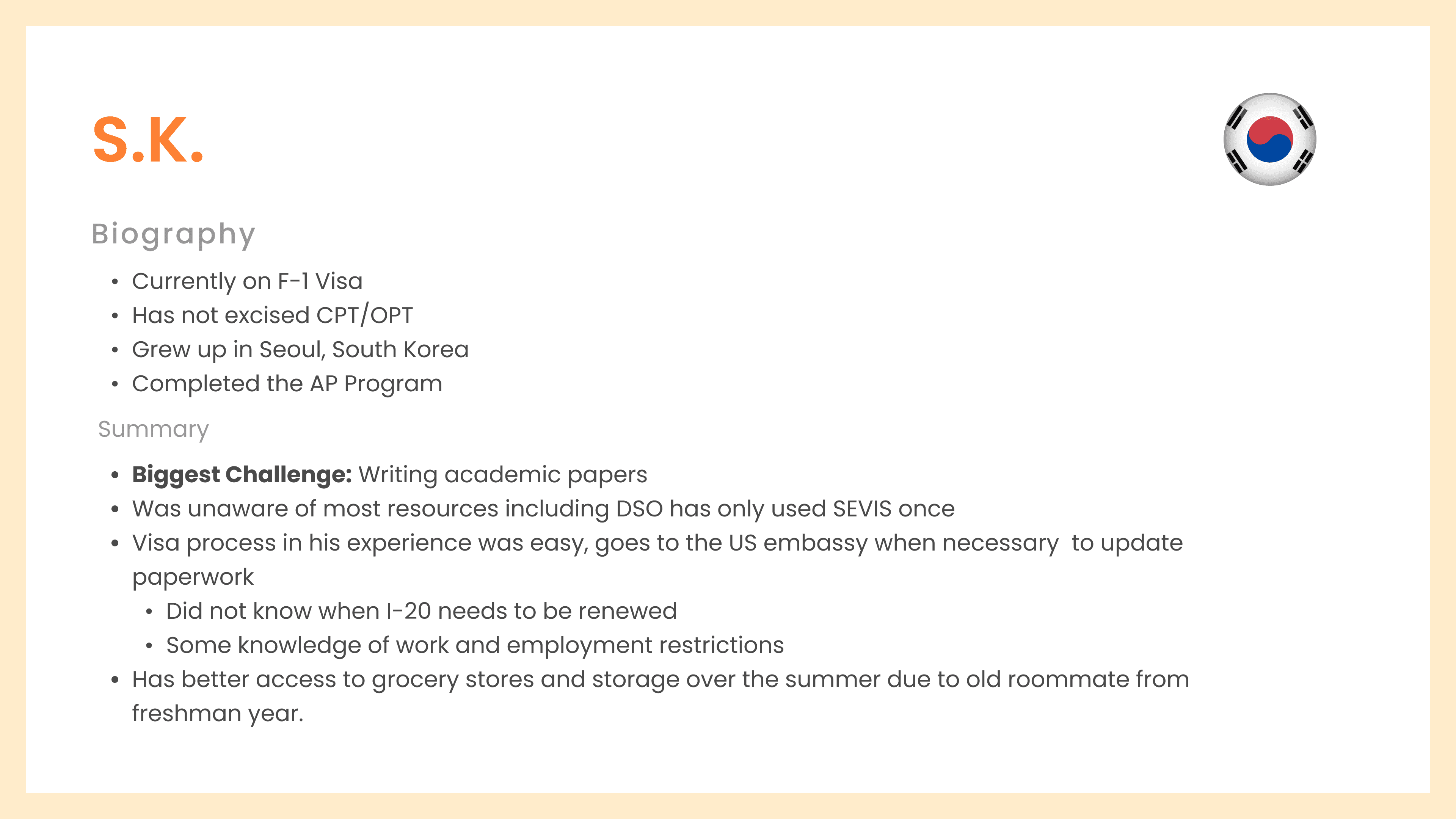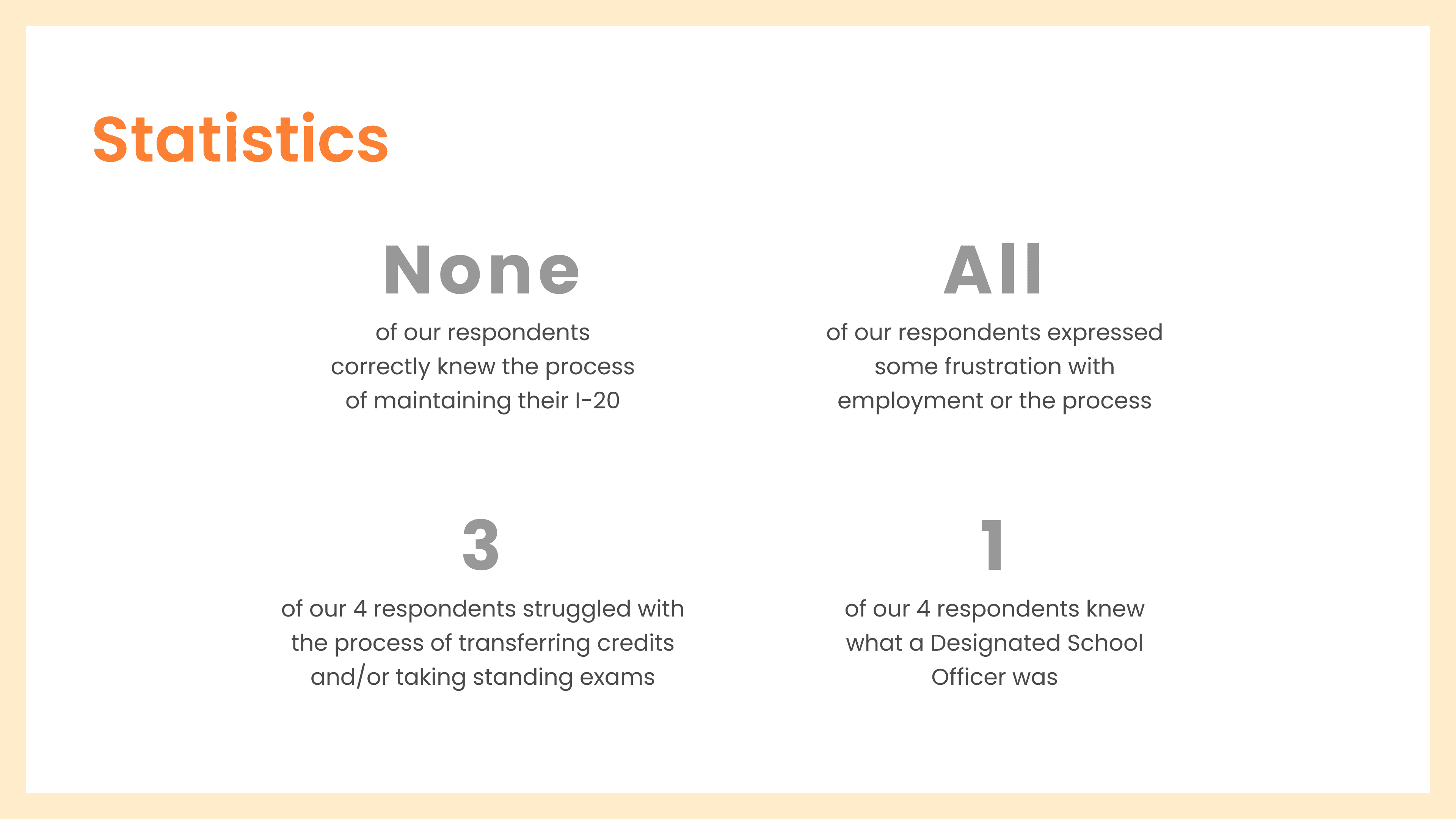 Each interview consisted of thorough questions relating to interviewees biggest challenges, experiences as an international, immigration, and travel, work and employment, essential services, and effectiveness of existing resources. We also tested their technical knowledge about terms like CPT/OPT work authorization, Designated School Officers (DSO), SEVIS, I-20, and more.