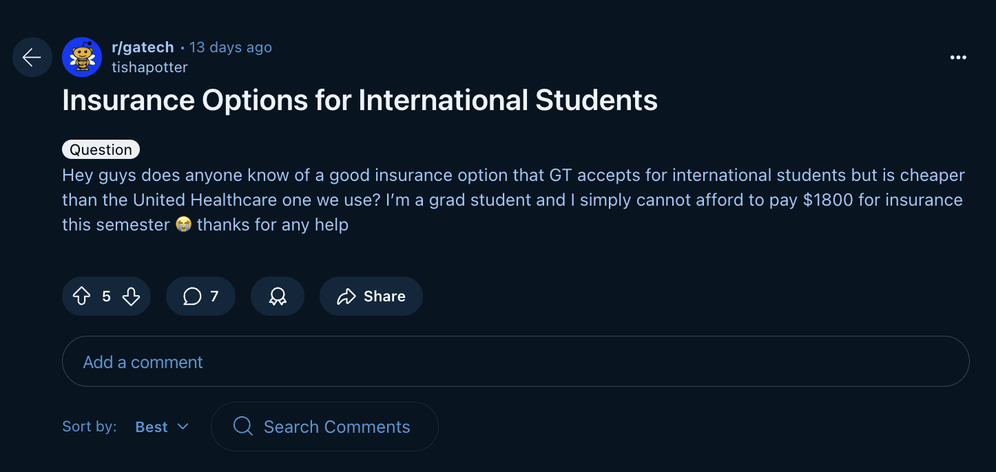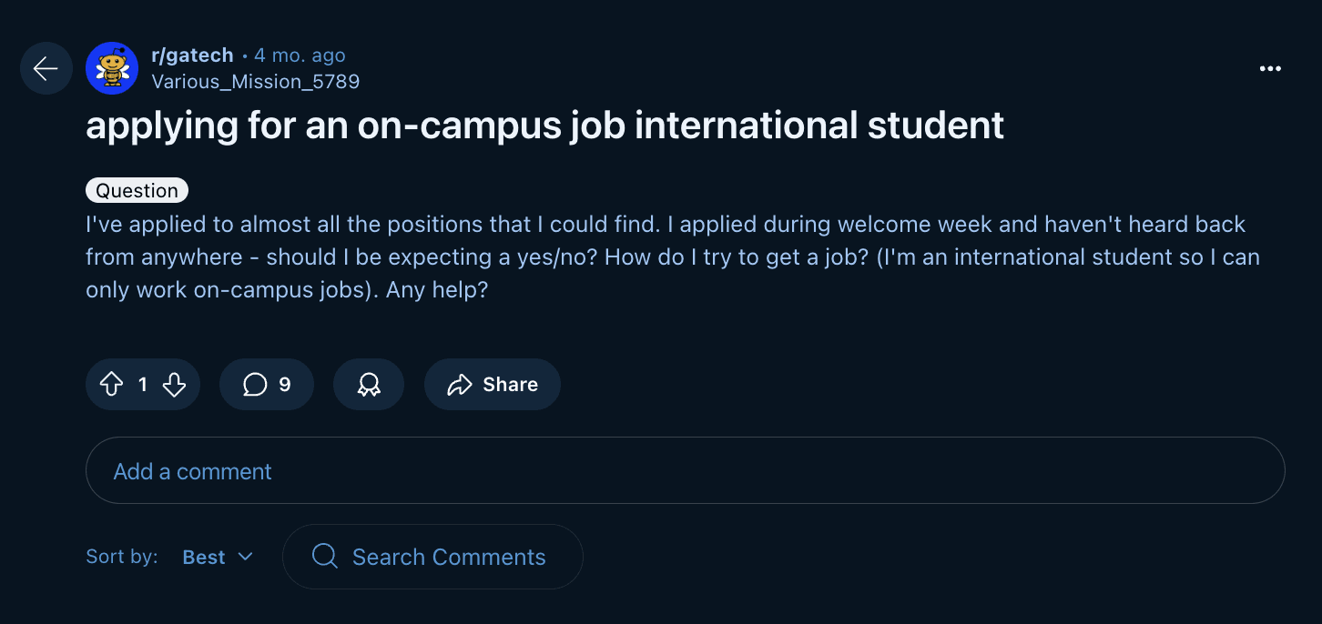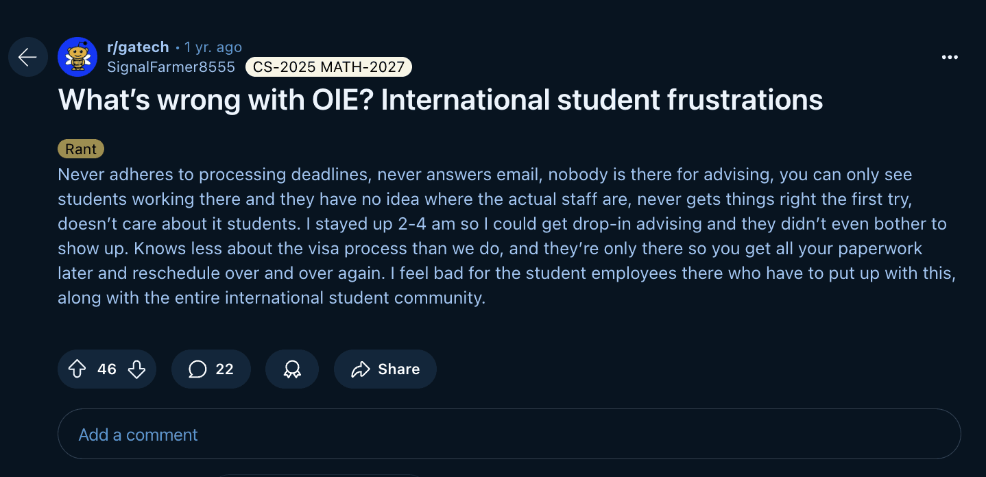 We examined GT subreddit posts and it became clear that international students mostly fall on the platform to answer questions that should be directed toward OIE. One student even expressed clear frustration with the OIE that is up-voted by many other users.