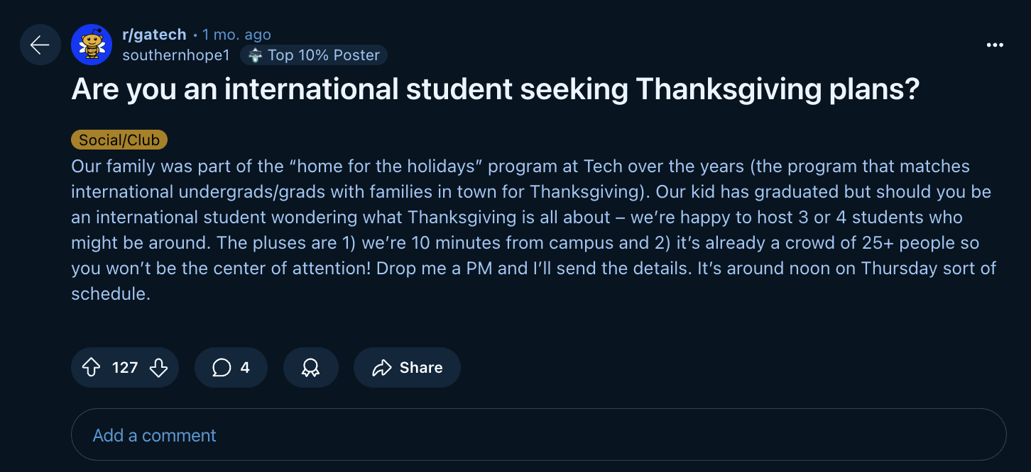 While Reddit is accessible and easy-to-use, it has its own issues. Any user can join GT's subreddit and post and reply. It's unorganized and difficult to find specific information and there is no specific subreddit for international students at GT. Its one benefit is that it facilitates a dialogue between students. For example, one user made a post inviting international students staying on campus during Thanksgiving to their home. No other platform has this level of outreach.
