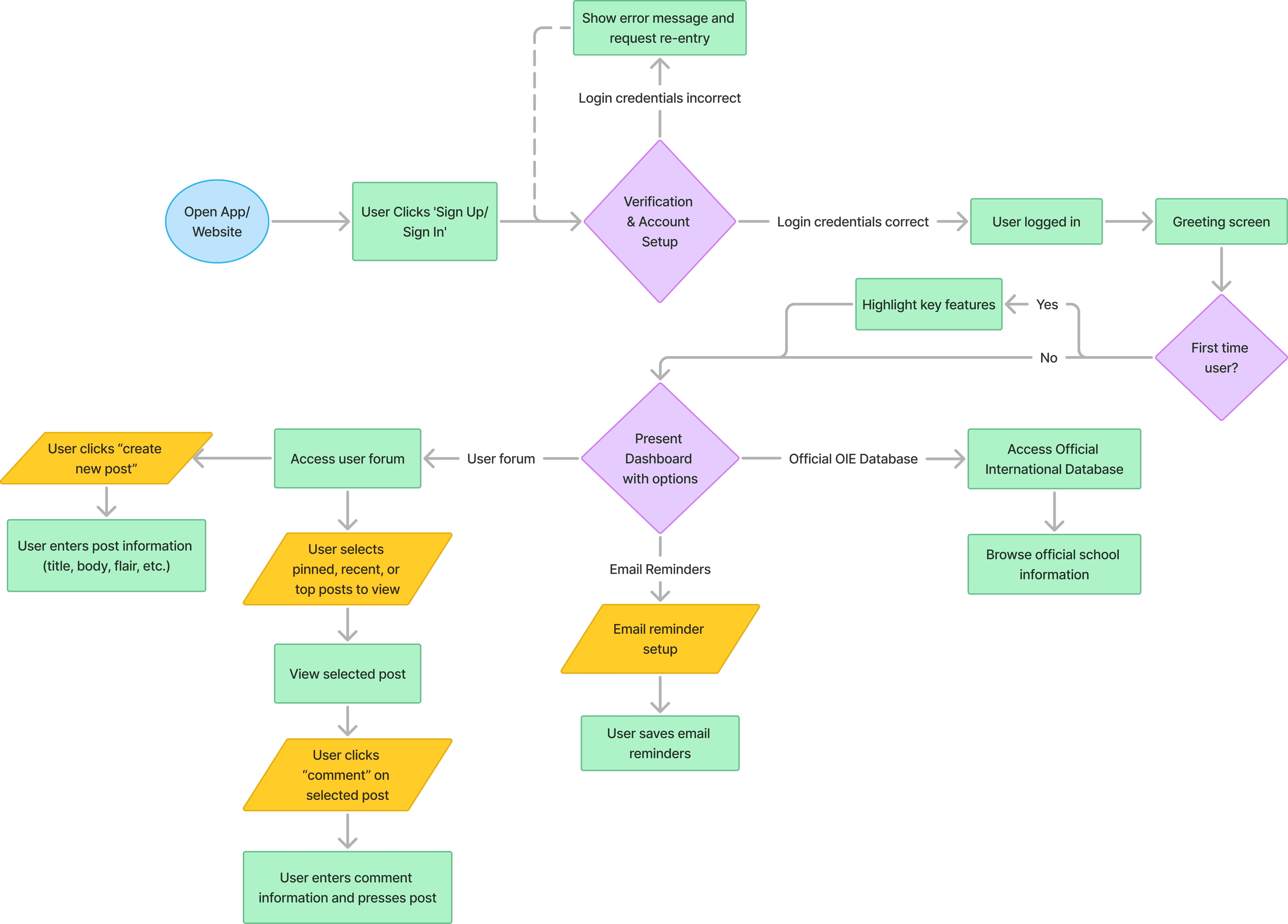 The user flow above effectively integrates the key features of our final design recommendation. It streamlines access to official OIE resources and email reminders for timely updates while fostering peer collaboration through a user forum where students can post, reply, and share curated resources like company sponsorship lists or break plans. The flow also supports logistical needs, such as coordinating summer storage, and ensures first-time users are guided with platform highlights, creating a comprehensive, user-friendly system to address the common challenges faced by international students at Georgia Tech.