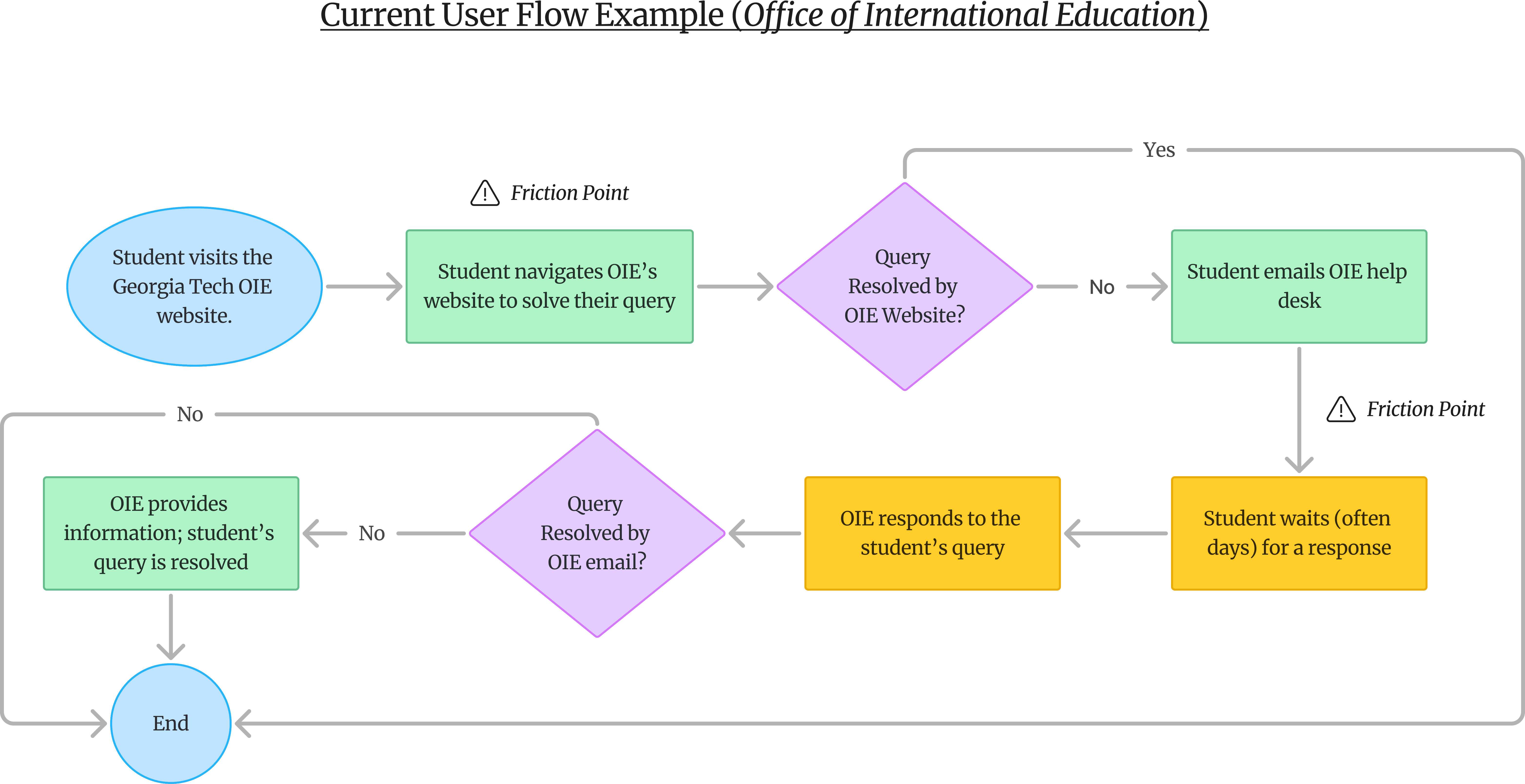 In this example, we assumed how a student may resolve an international-specific query. Friction points included navigating the dense and unintuitive OIE website and emailing OIE's help desk who can take days to respond to a query. Creating these flows narrowed our problem scope and, though they were assumptions, they guided us toward specific bottlenecks. During interviews, being cognizant of these user flows allowed us to probe general areas of frustration and further pinpoint specific struggles.
