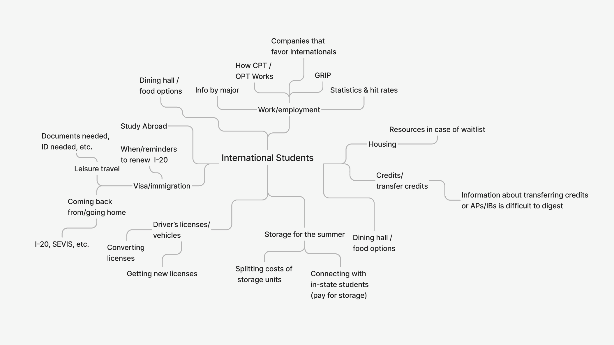 We identified various personal or anecdotal pain points and frustrations that international student face. The broad topics included Visas & Immigration, Work/Employment, Housing, Credits & Academics, etc. We discussed problems students may face in these domains and created user flows for existing infrastructure.