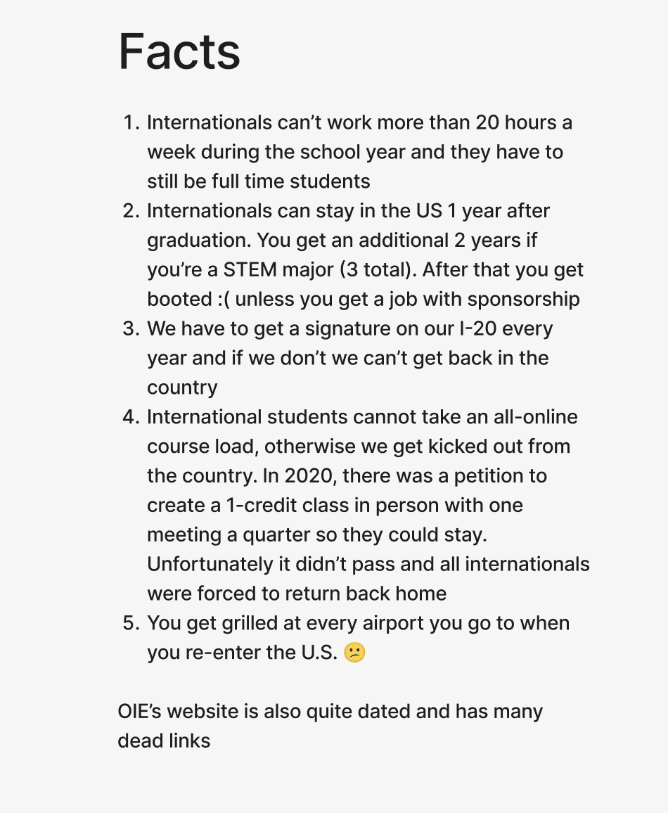 To identify whether a solution was needed, we began by researching existing infrastructure designed to help international students, targeting research goal number 6. Our first and most crucial observation — the insight that indicated the need for a solution — was that we had no direct competitors. There was no platform designed to make international students' lives easier that holistically addresses work and employment, visas, credits, housing, and more.